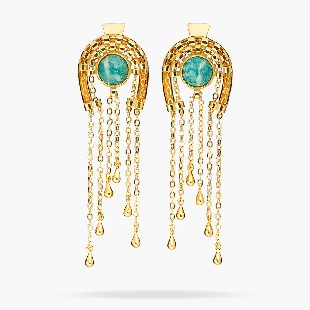 Дизайн, где глубокий зеленый цвет встречается с динамикой золота. В центре — натуральный амазонит, который служит ярким, статичным акцентом для живого, подвижного каскада из золотых цепочек.