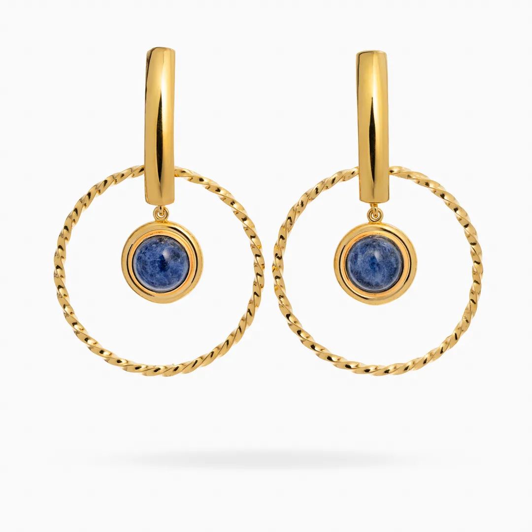 Содалит — камень с насыщенным сине-серым оттенком и природным рисунком — придаёт украшению глубину и индивидуальность. Позолоченный ювелирный сплав добавляет тёплого блеска, делая серьги выразительными и утонченными одновременно.