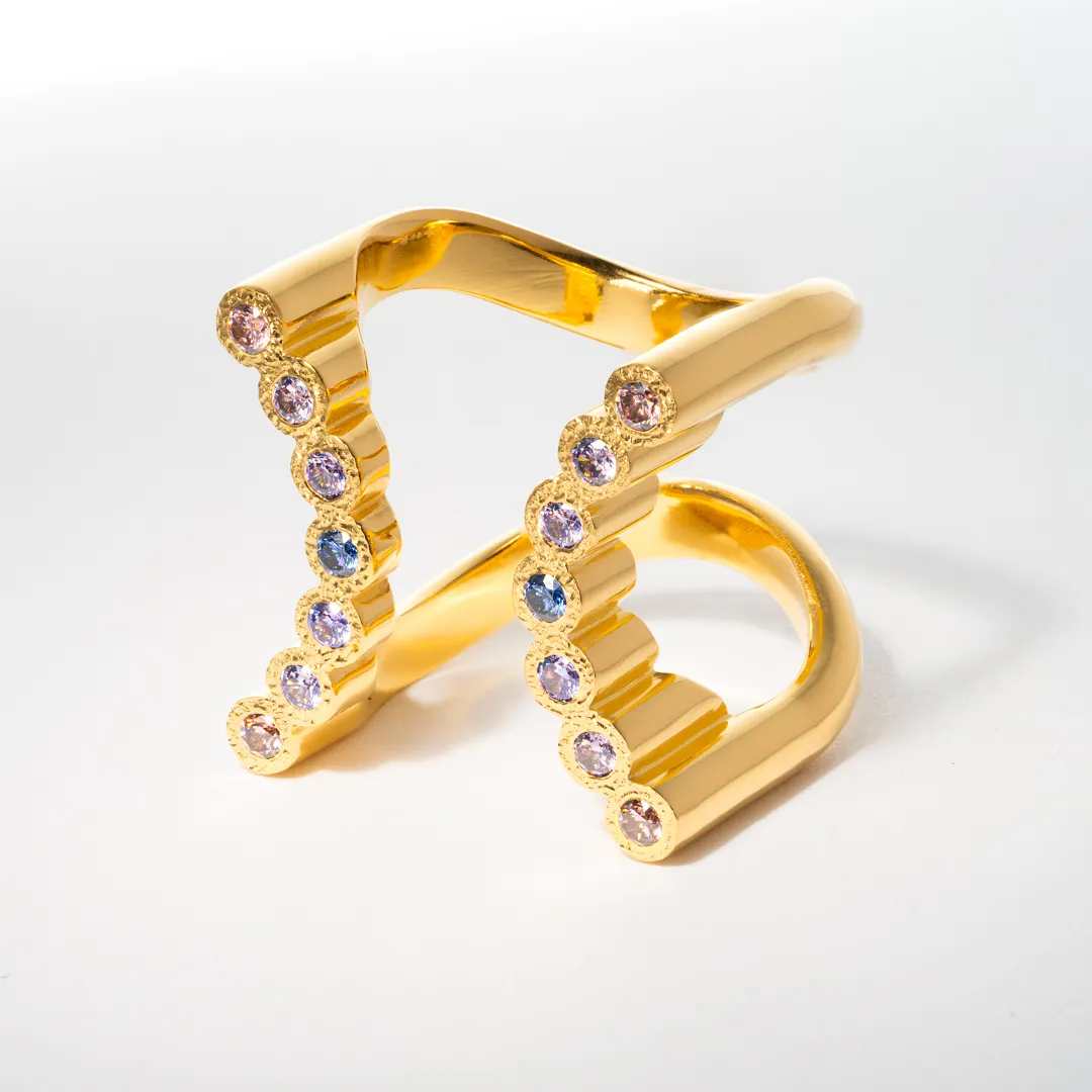 Кольцо XO — это гармоничное сочетание утончённости формы и деликатной цветовой палитры. Россыпь сияющих фианитов в оттенках от светло-лавандового до почти небесно-голубого создаёт мягкое мерцание и добавляет образу лёгкости.